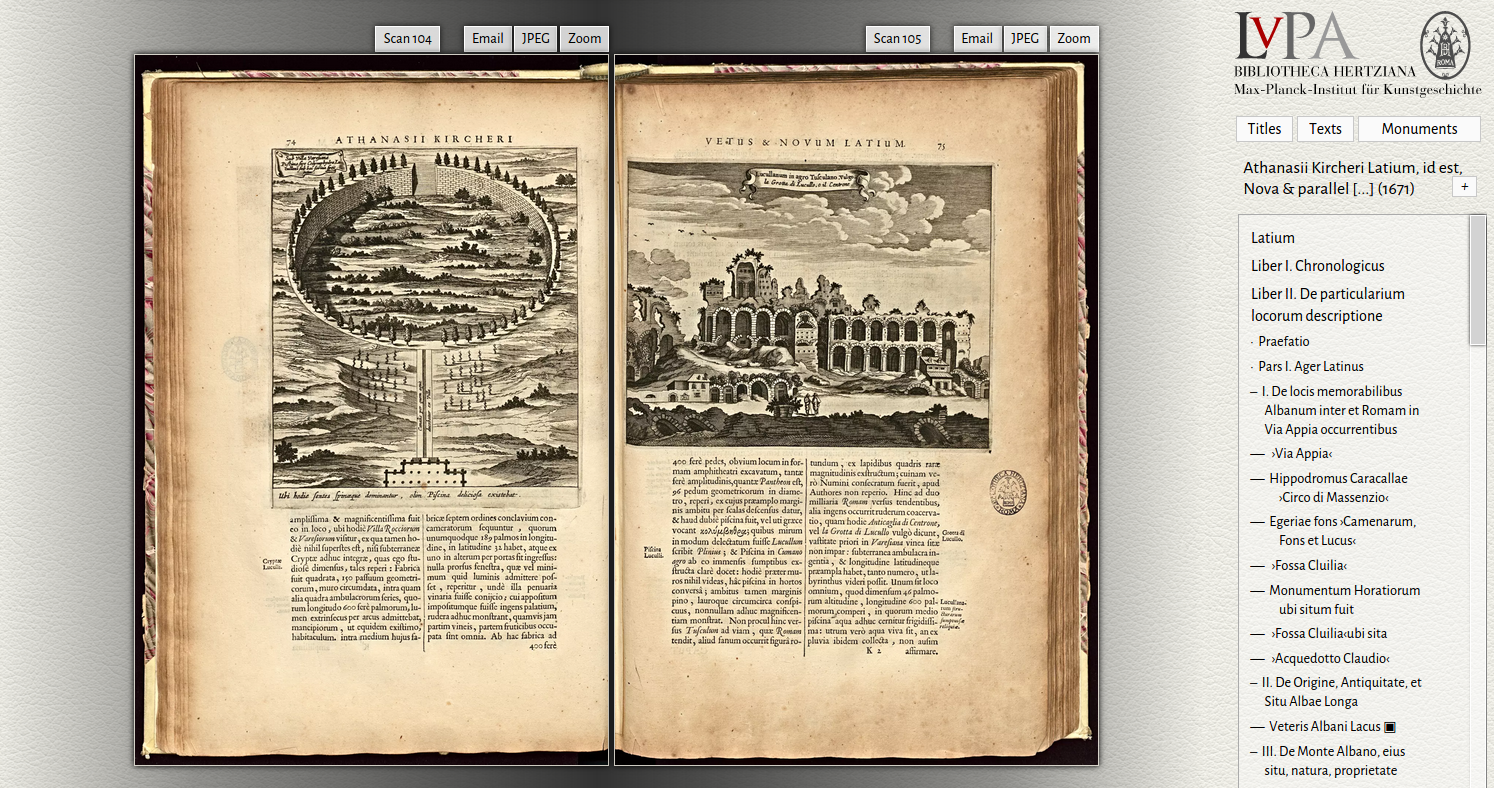 LVPA collects all printed works digitized by the Bibliotheca Hertziana, striving for a quick and simple presentation with the possibility to download single pages or the whole book. In addition, LVPA indexes and extracts all references (texts and images) of Roman monuments and visualizes them on a map. The underlying data can be downloaded and re-used for non-commercial purposes.